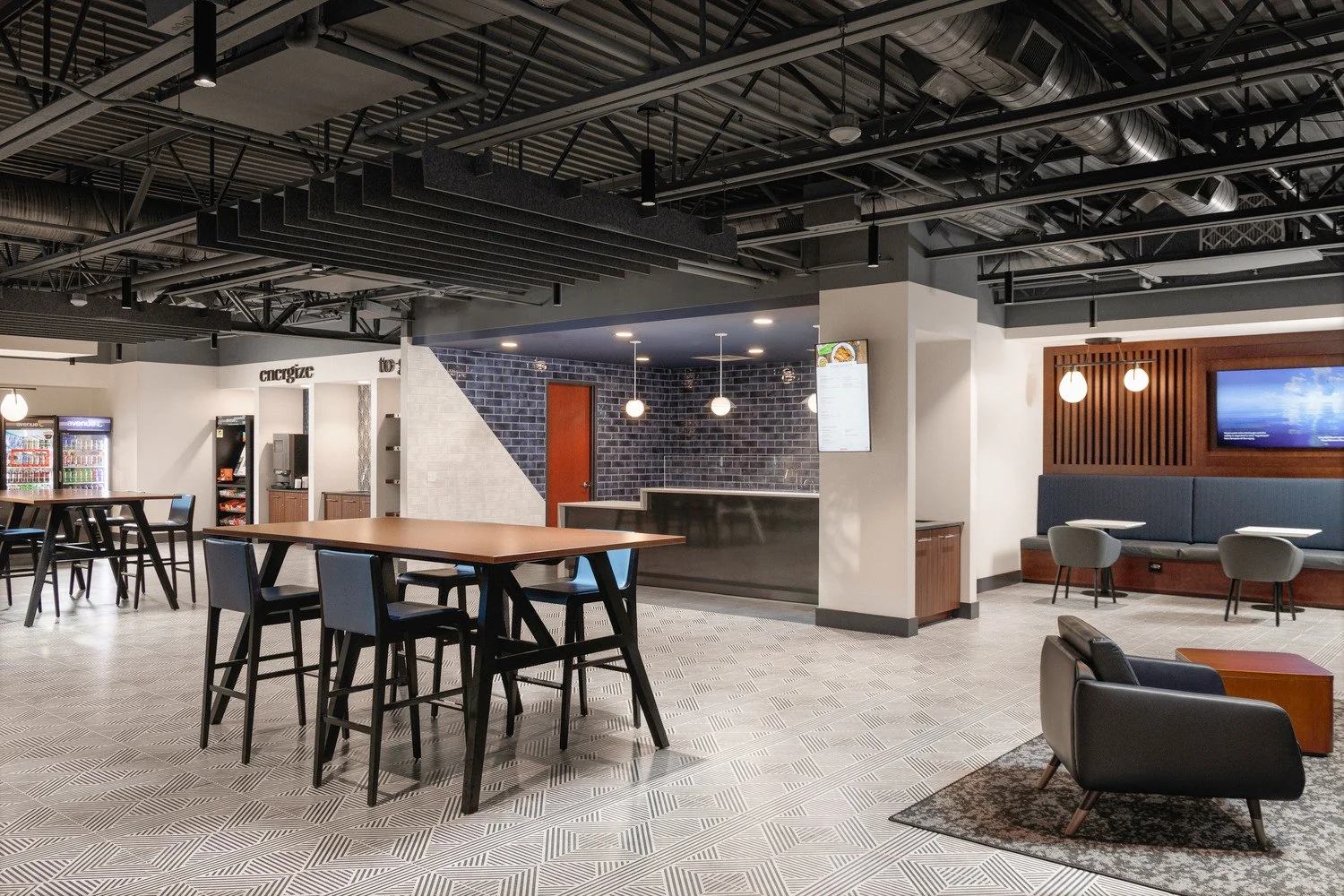 The project introduced a revamped atrium with coworking and lounge spaces for all tenants, complemented by a beautiful custom chandelier that filled the previously empty vertical space. A refreshed indoor/outdoor cafe was designed to centralize food delivery, accommodate restaurant pop-ups, and provide healthier snack options. The courtyard itself was updated with diverse seating options to enhance its functionality. These improvements transformed the office park into a vibrant, multi-functional environment that supports the modern work-life balance in a post-Covid world.