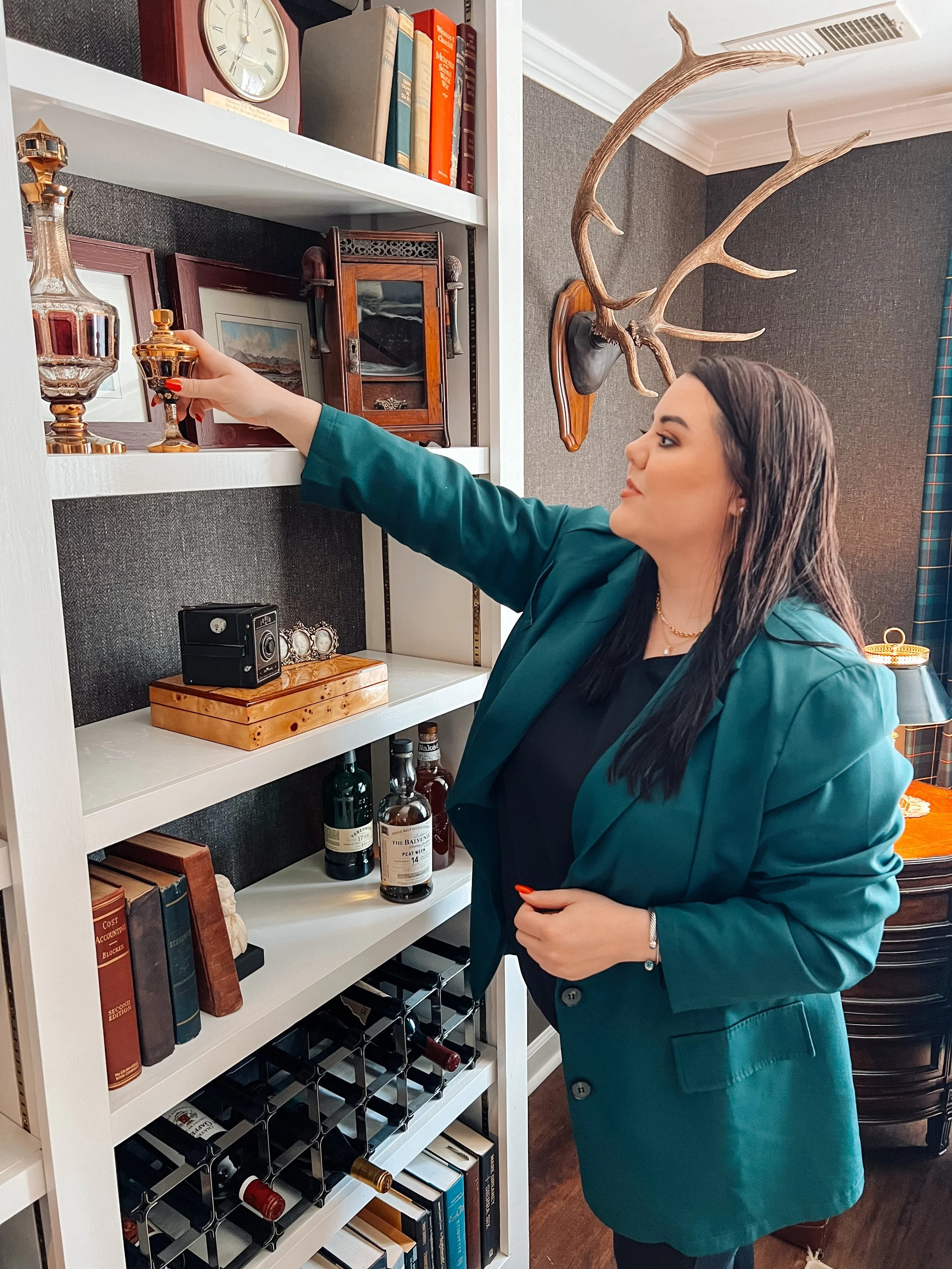 Throughout the room, we emphasized antique accessories to give it character and charm. The combination of these elements—dark colors, vintage-inspired furniture, and subdued lighting—creates a perfect blend of a library’s quiet elegance and the relaxed, moody ambiance of a smoking room.